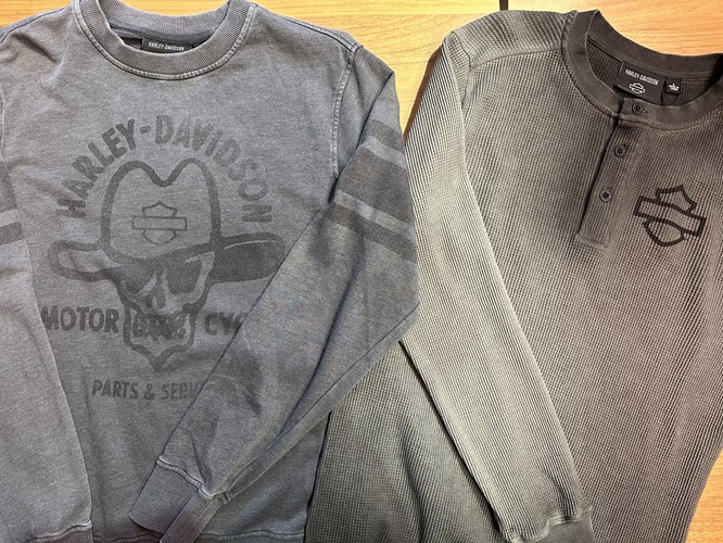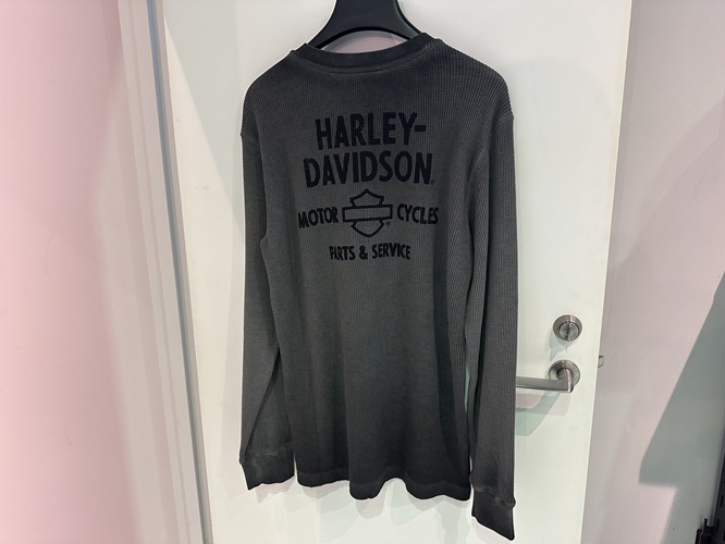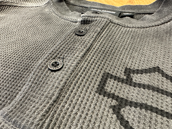 ワッフル素材のトップス、グラデーションの効いたダークグレーのカラーリングでオープンB&Sをデザインしたシンプルな1着です。