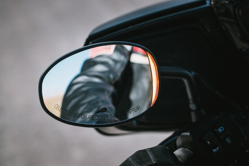 後方の車両がライダーが快適に走行できないほど接近している場合に、ライドコマンドの画面とサイドミラーのインジケーターでライダーに警告します。