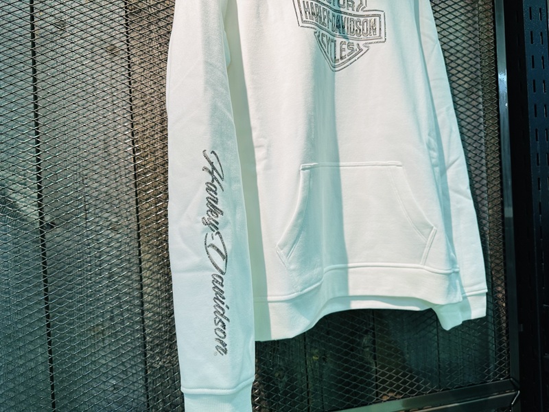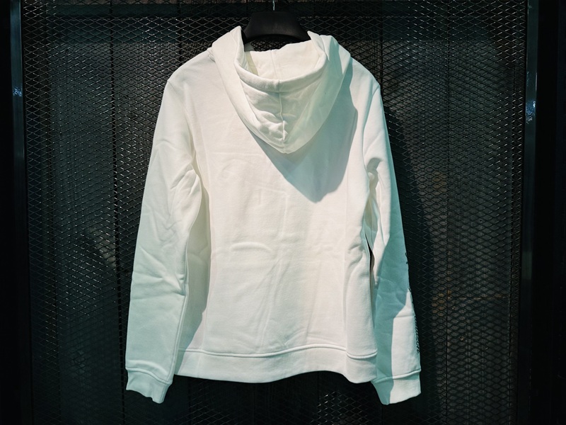 真っ白なフーディーはフロントと右袖にロゴがデザインされボディーカラーに馴染みながらも主張のある1着に。