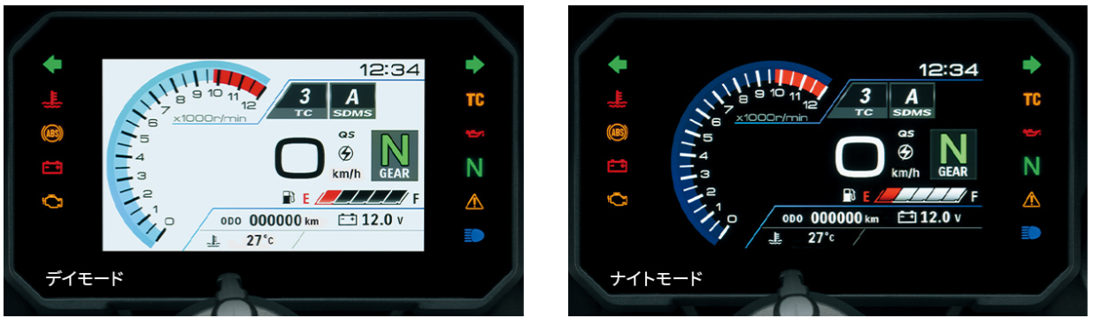 メーター液晶はデイモード(白)とナイトモード(黒)の表示モードを手動または自動で切り替えることができます。