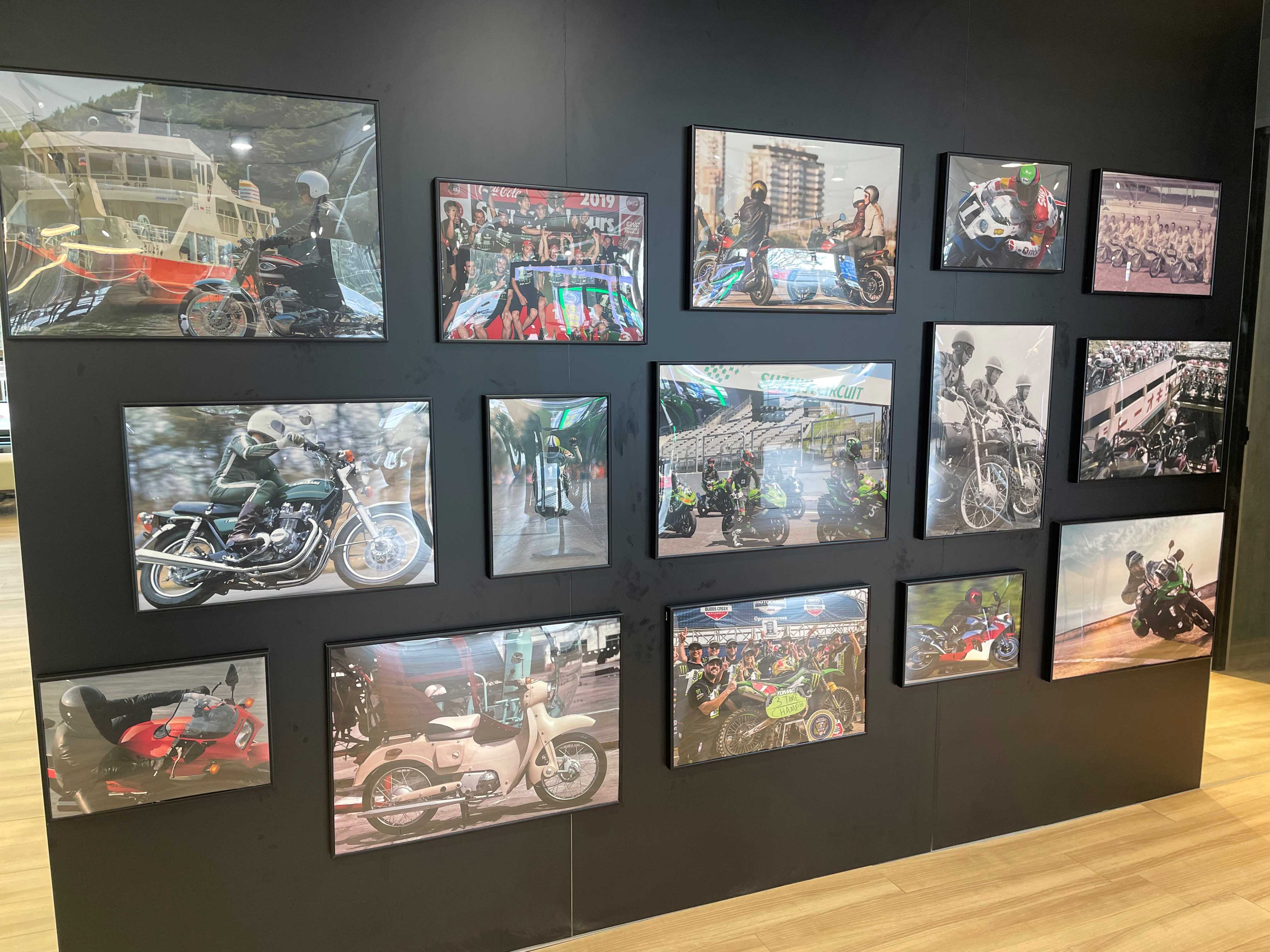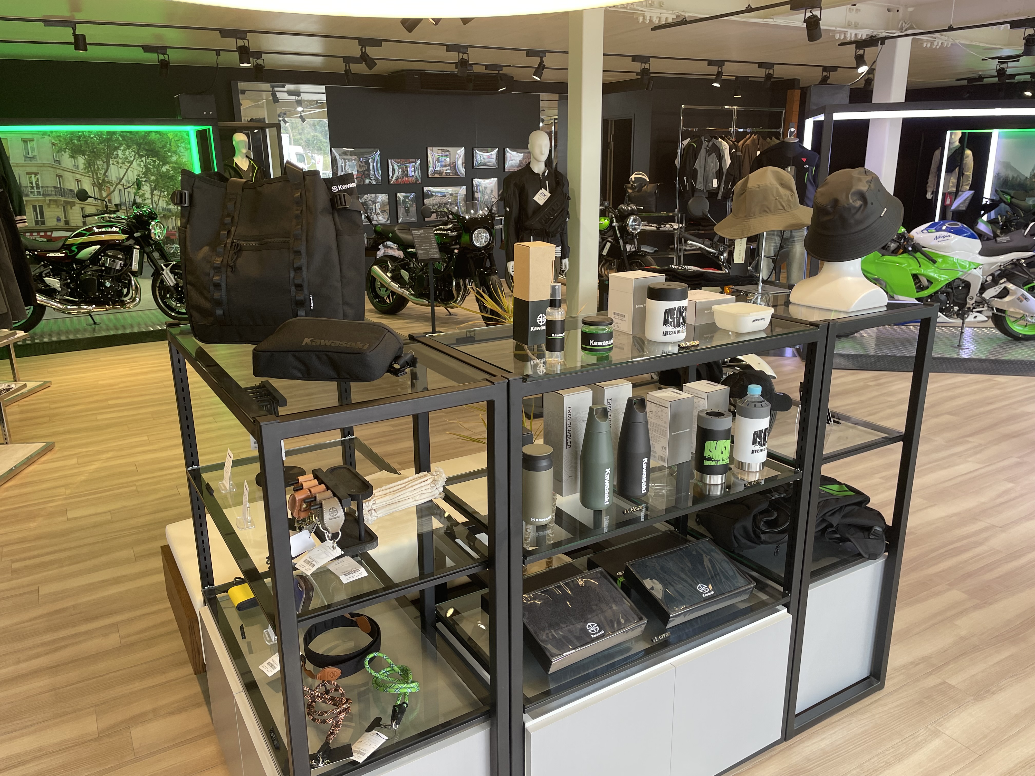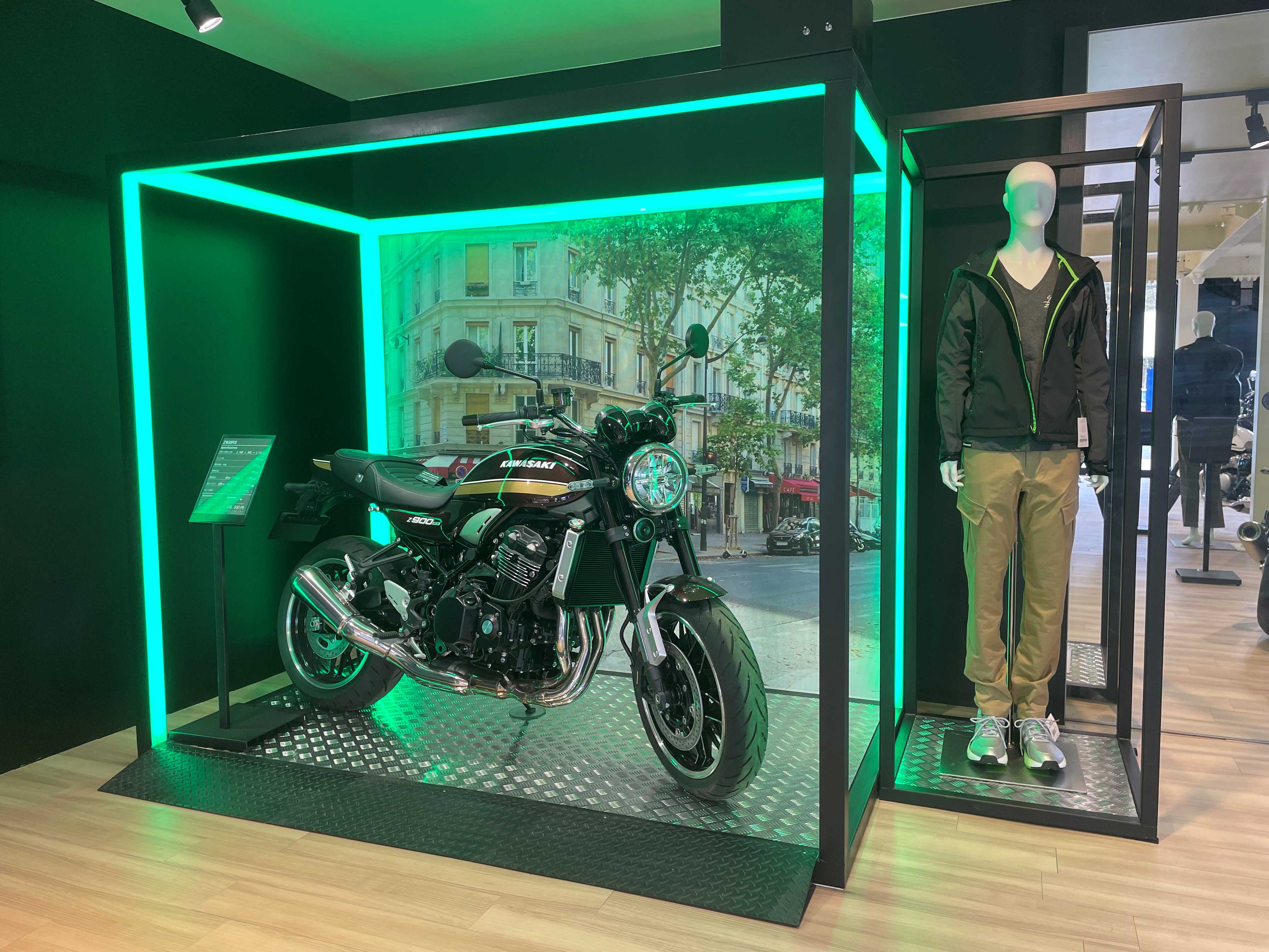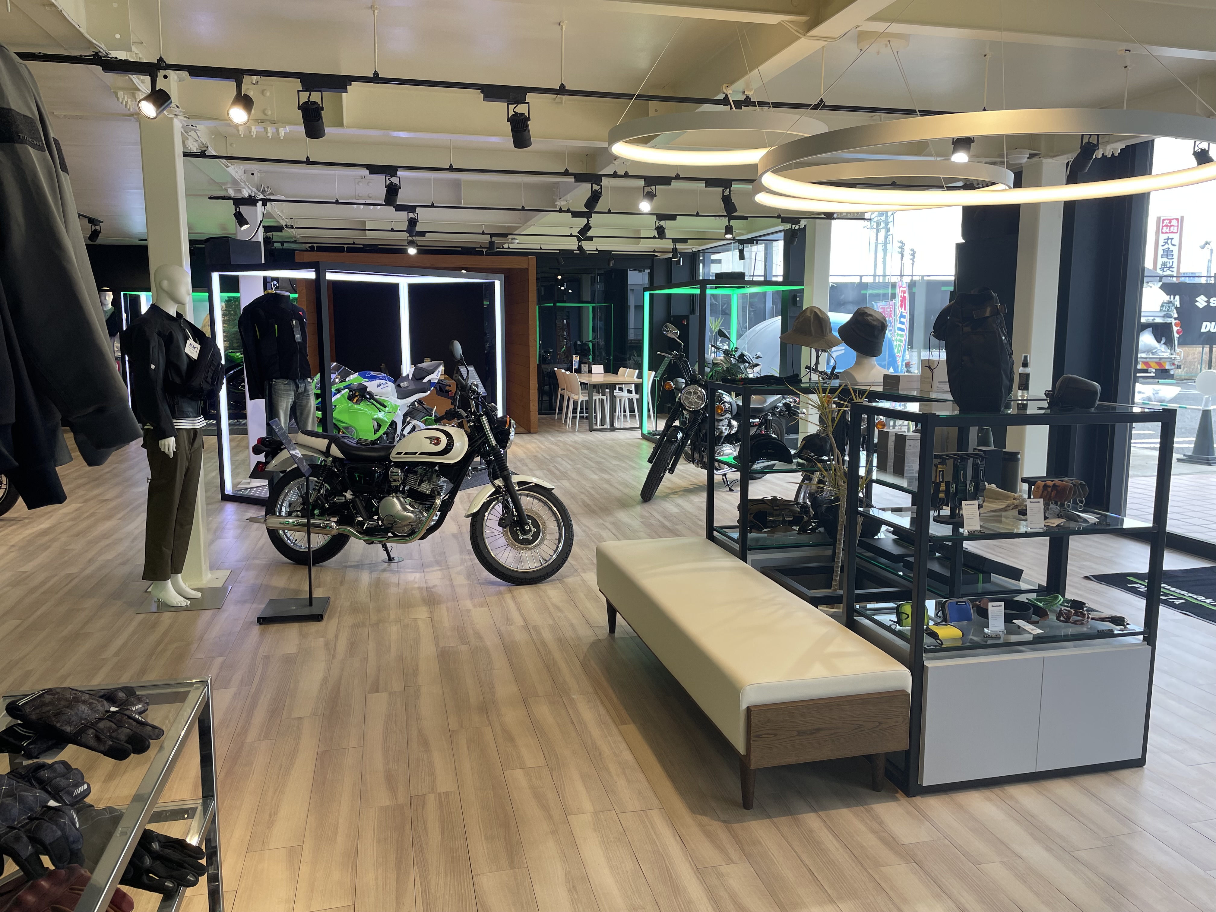 最新のモーターサイクルとカワサキプラザ限定のアパレルを広々した空間で展示し、