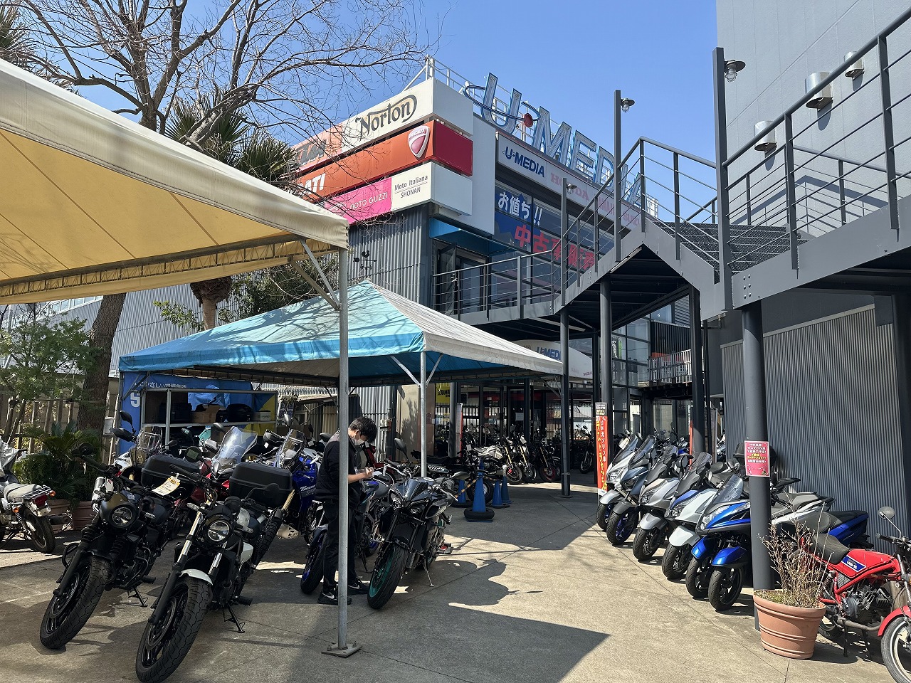 バイクの道の駅であるユーメディア湘南は、バイクを買うだけでなく、皆様が楽しくお過ごし頂けるようカフェや遊具、旧車の展示スペースなども!