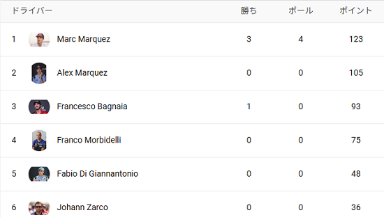 今現在、マルケスが123ポイントを取得し、チャンピオンシップ首位。