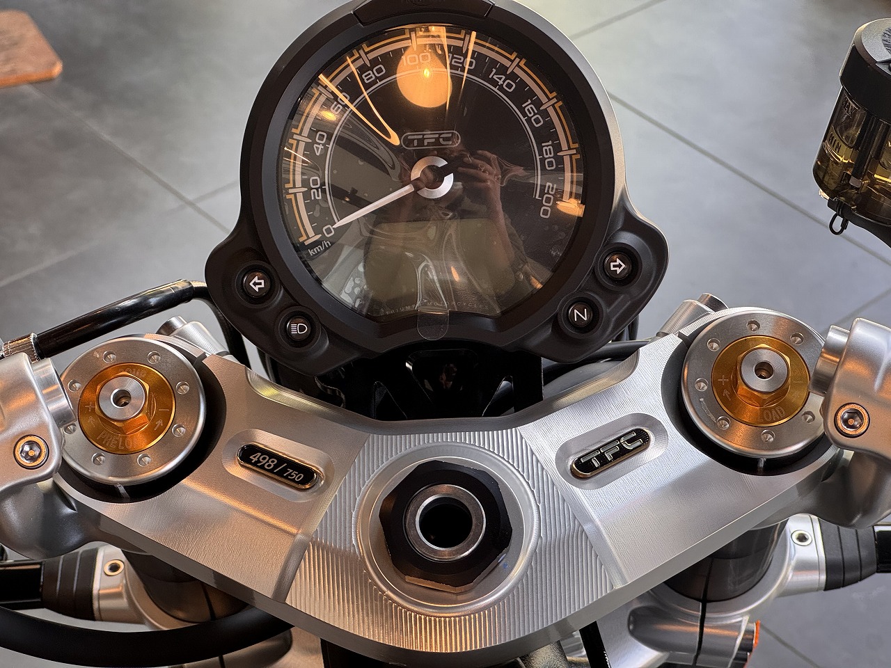 世界限定750台、ビレット加工のトップヨークにシリアルナンバー入りのバッジが付いたこの特別なモデルには