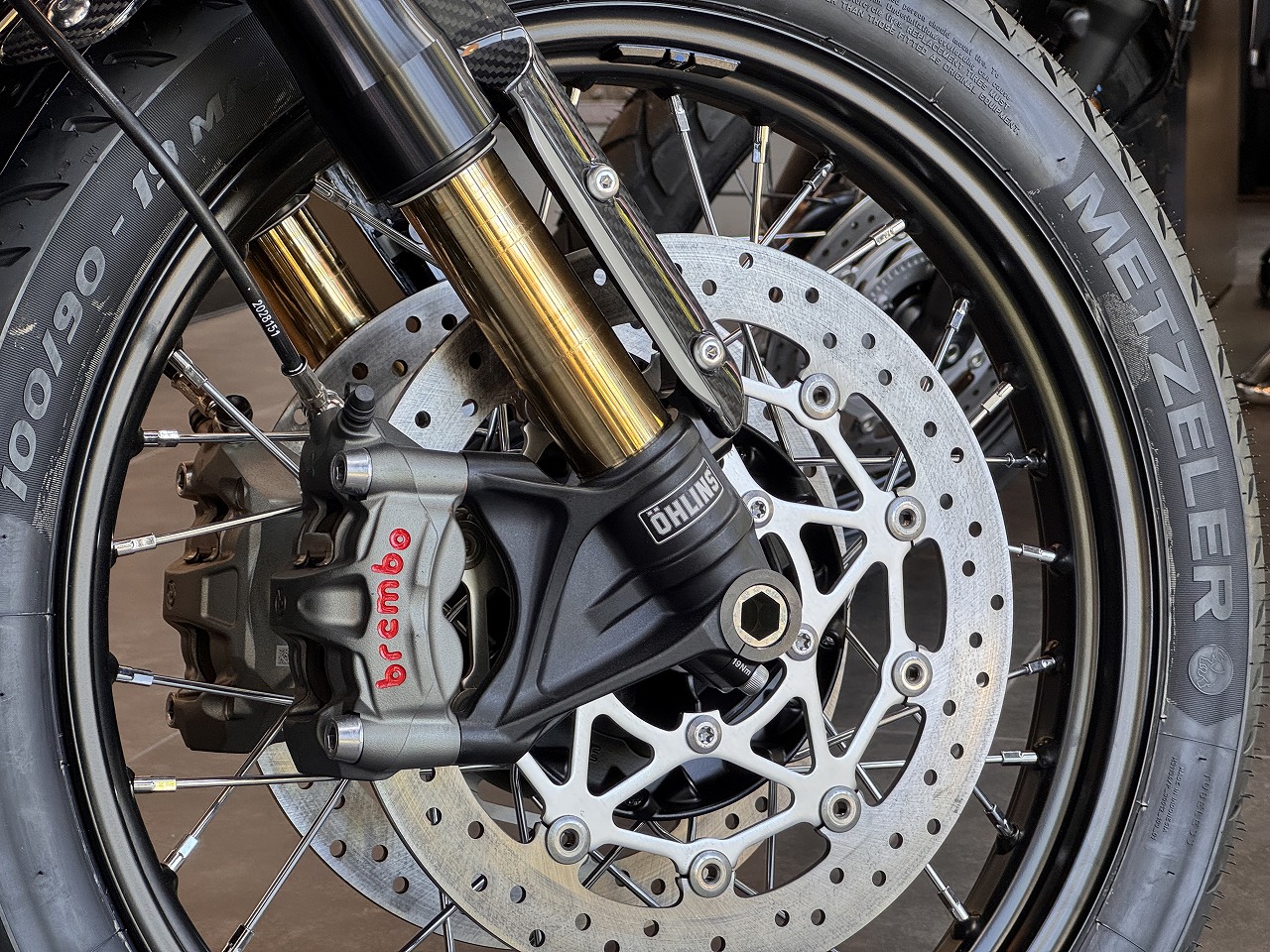 フロントとリアにオーリンズ製のハイスペックサスペンション、ブレンボ製ラジアルモノブロックブレーキと