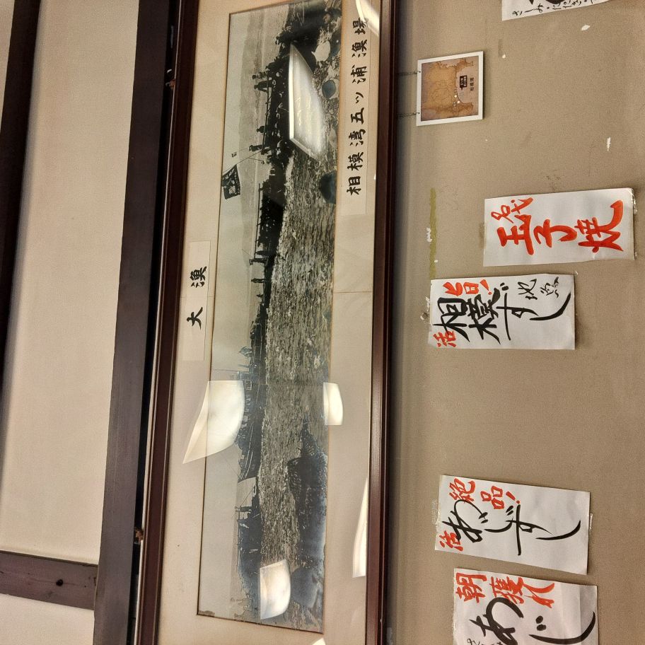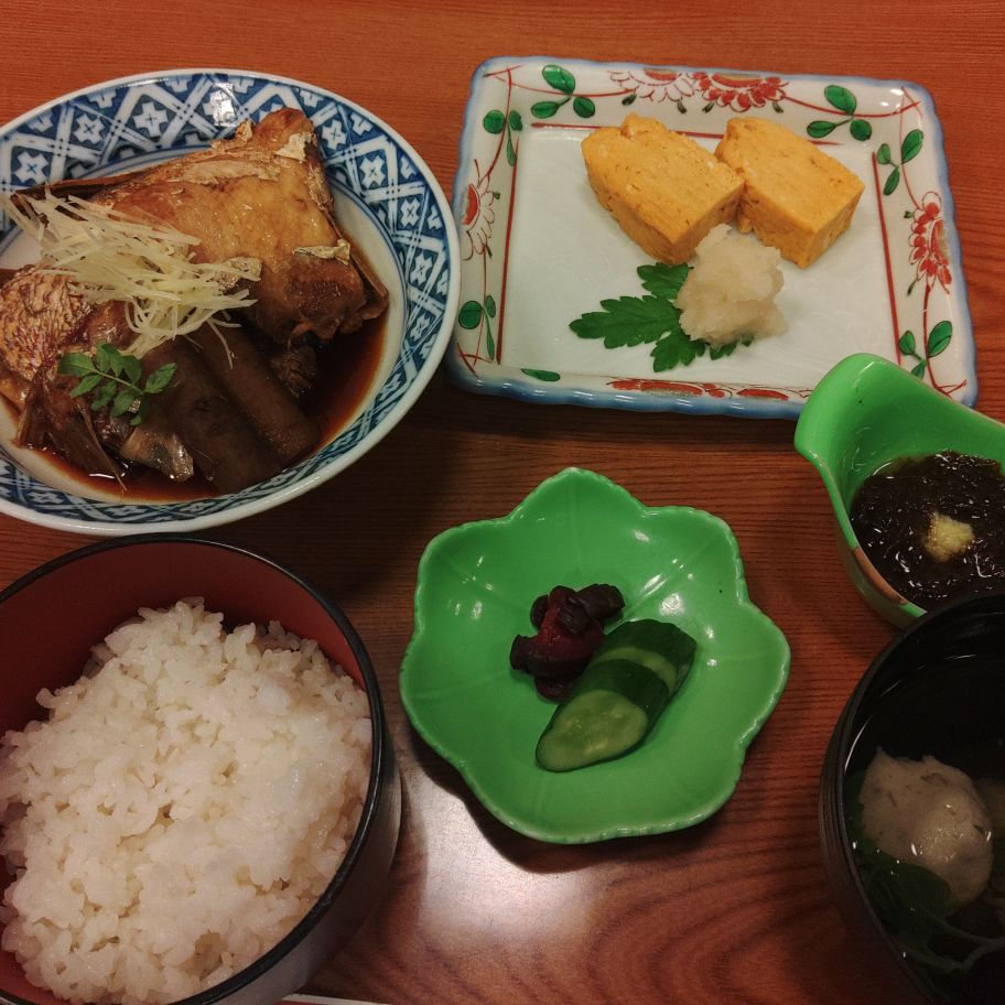 天丼がオススメのようで、あじや地魚ずしも気になりましたが、壁に貼られた卵焼きに心惹かれ、卵焼きが付いている煮魚定食を選びました。五ツ浦漁場というところがあったんですね~。