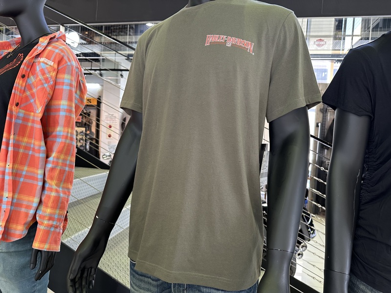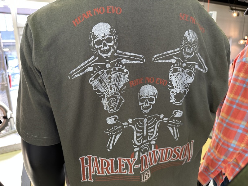 背面にはエボリューションエンジンがポップにデザインされたカーキのTシャツ、ヴィンテージ風のプリントが特徴的です。