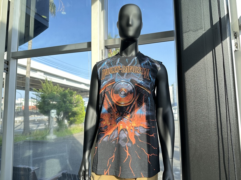前面に大きくデザインされた迫力のある主役級のノースリーブトップスは、ハーフパンツと合わせて一気に夏の装いに!