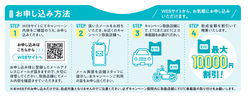 □対象エリアのキャンペーン取扱店舗にて、購入・セットアップ・取り付けを行った方が助成対象となります。