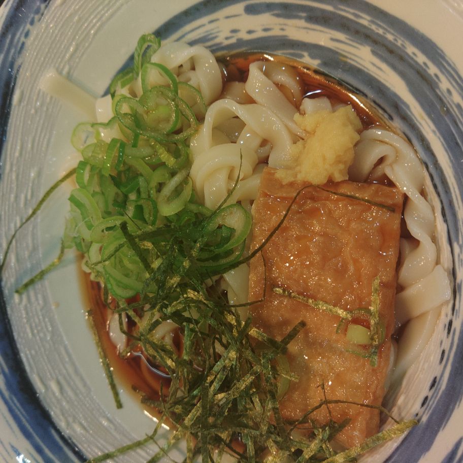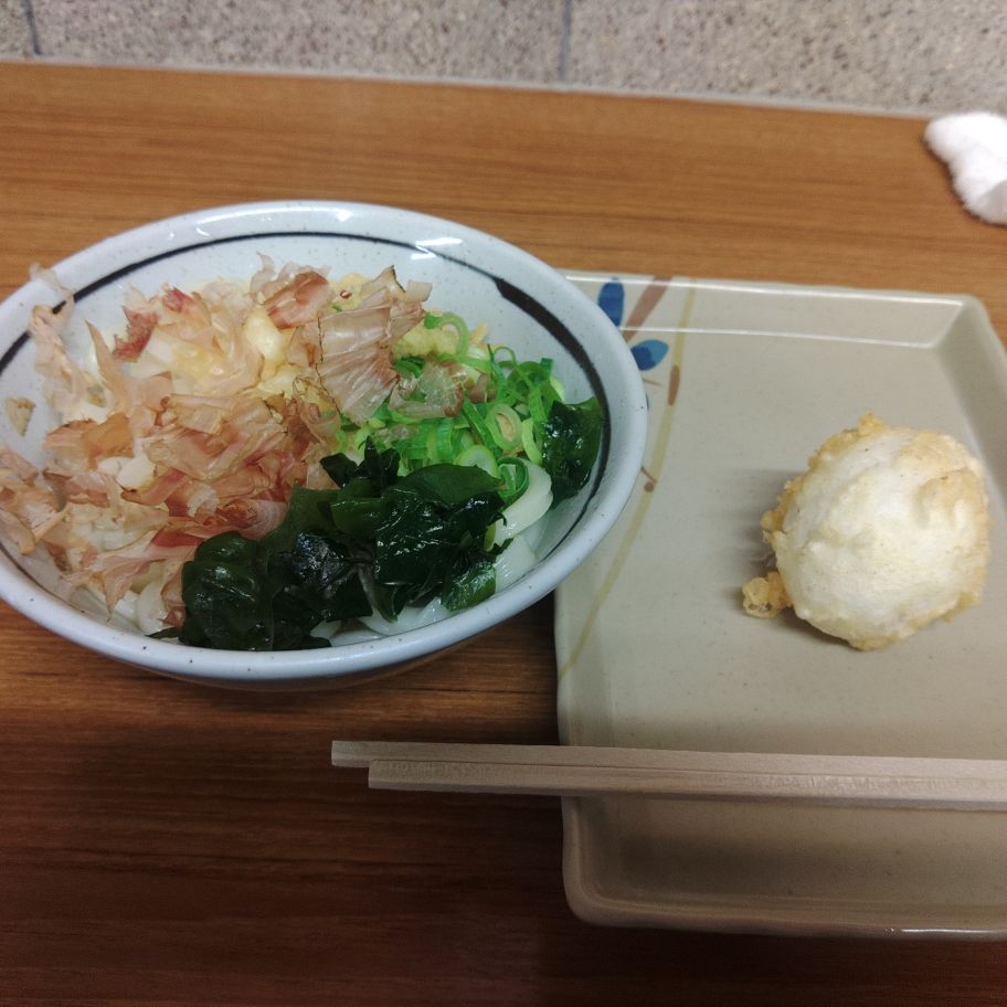 ここは出てきた麺を自分でお湯に10秒ほど付け、だし汁をかけて食べるスタイルでした。ワカメ、かつおぶし、ネギ、しょうがをトッピングし