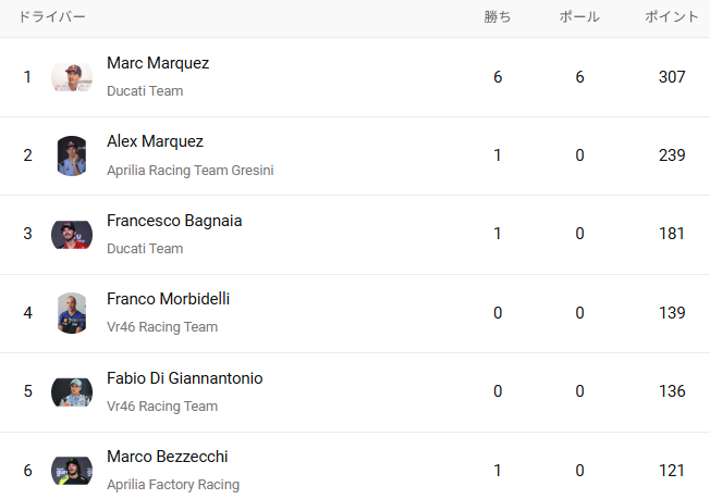 現在はマルクマルケスは307ポイントで2位のアレックス・マルケスに68ポイントの差をつけております。