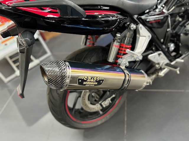 マフラーとタンクパッドがヨシムラで統一されており、その他のカスタムも赤と黒でまとめられていてかっこいいです!