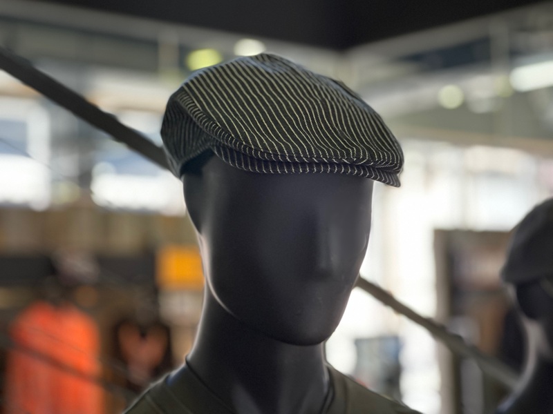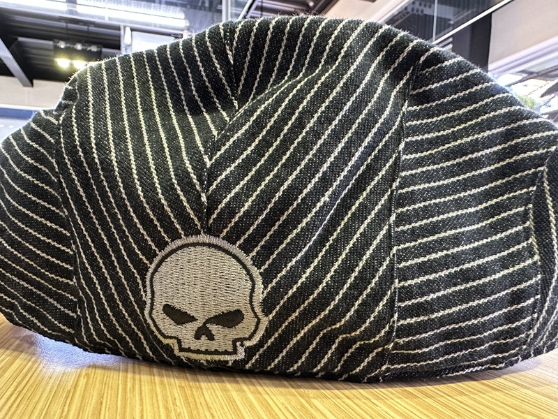ハンチングはストライプデザインで落ち着いた色味、バックにはウィリー・G・スカルの刺繍入り。