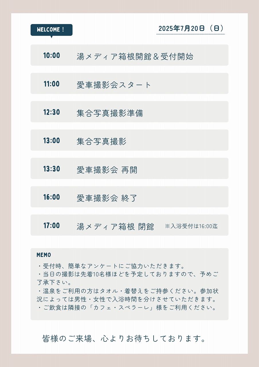今週末7/20(日)は湯メディア箱根イベント「愛車撮影会」です。