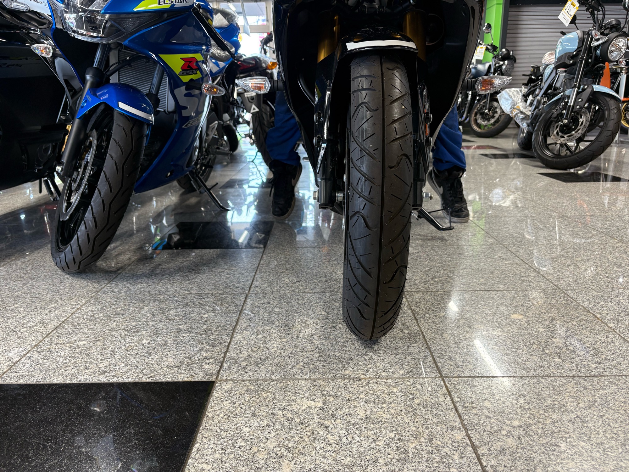 GSX-R125の足つきとなっています(1枚目身長175cmのスタッフ、2枚目身長160cmのスタッフ)