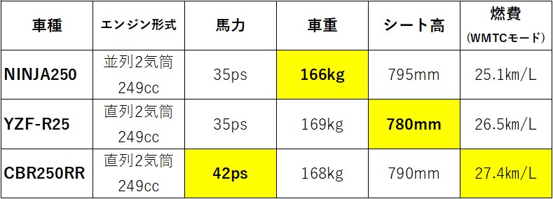 今回はNinja250(カワサキ)・YZF-R25(ヤマハ)・CBR250RR(ホンダ)の国産3強を比較して、