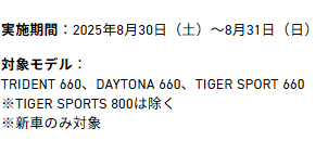 ※トライデント660、デイトナ660試乗車をご用意しております。タイガースポーツ660はご用意出来ておりません。何卒ご了承の程お願い致します。