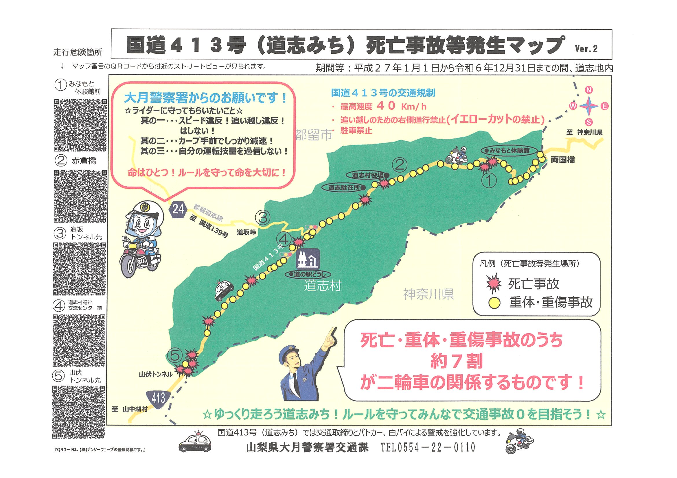 ◎ライダー一人ひとりの意識が、事故を減らし、道志みちを安全で気持ちのよい道にします。