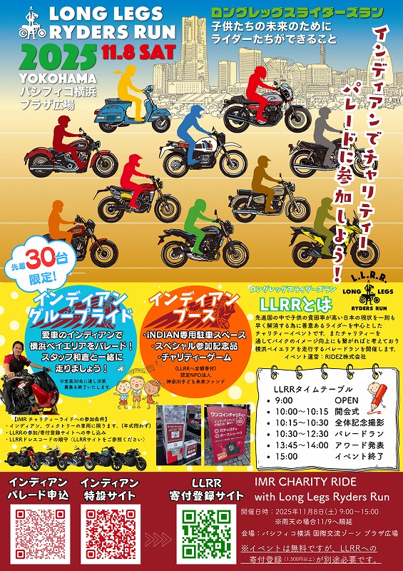 横浜発モーターサイクルアパレルメーカーのRIDEZ(ライズ)様主催イベント「LONG LEGS RYDERS RUN 2025」(ロングレッグス ライダースラン)※略称:LLRRにインディアンモーターサイクルは毎年参加しております!