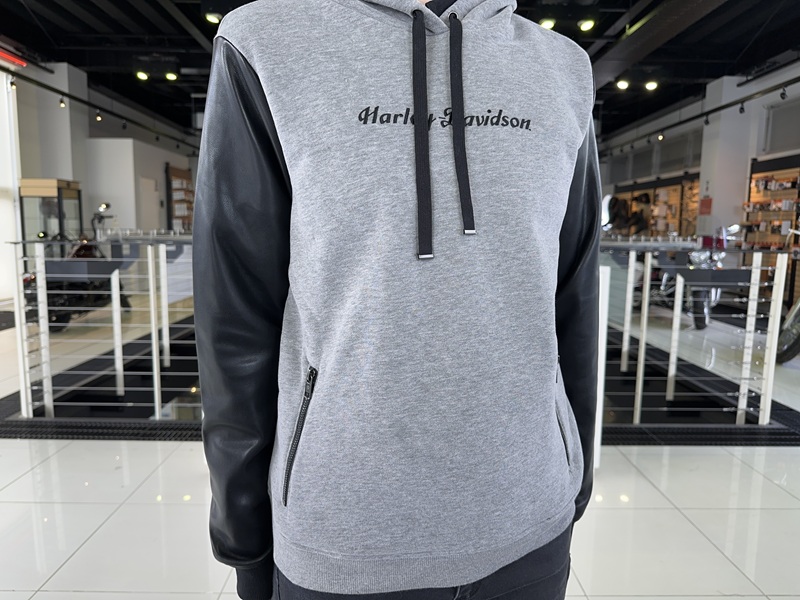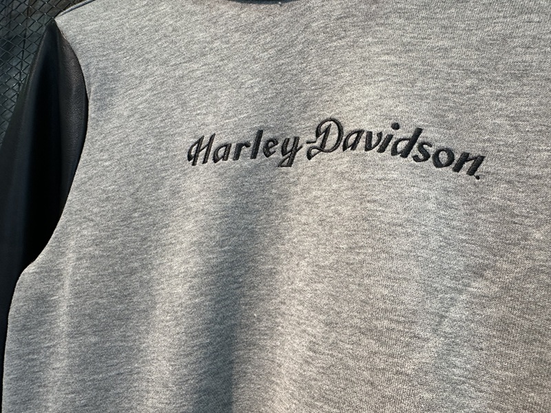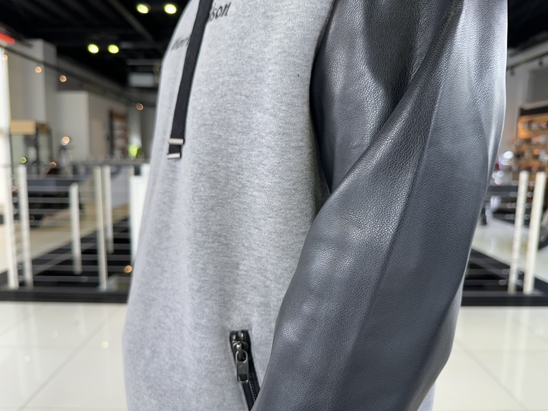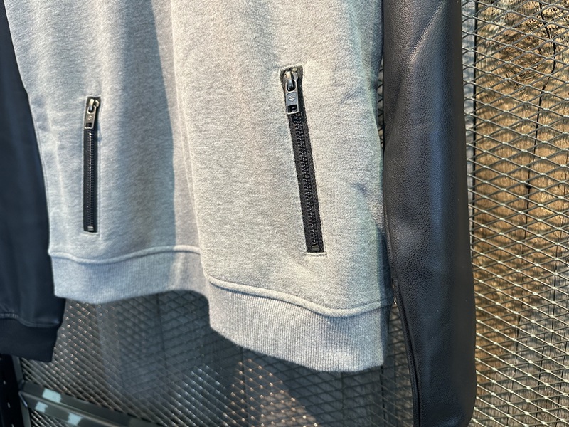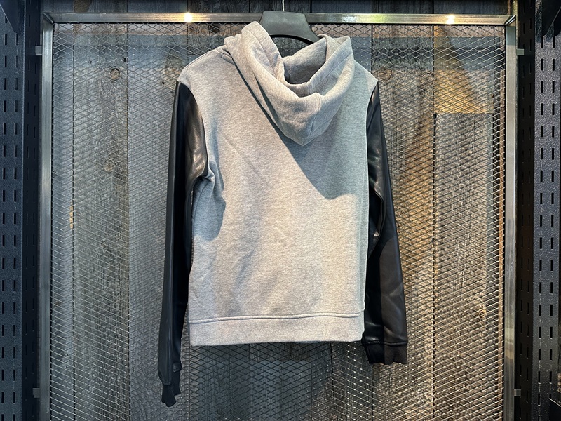 袖はフェイクレザー、ひもの先端にはメタルがついていたりと随所にちょっとしたこだわりも。