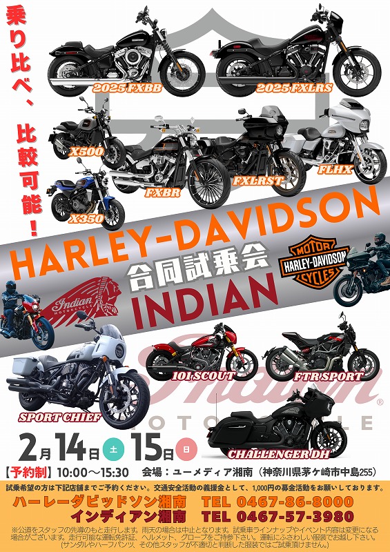 2日間は「ユーメディア湘南店(本店)」にて【インディアン×ハーレー合同試乗会】を開催!※試乗予約制