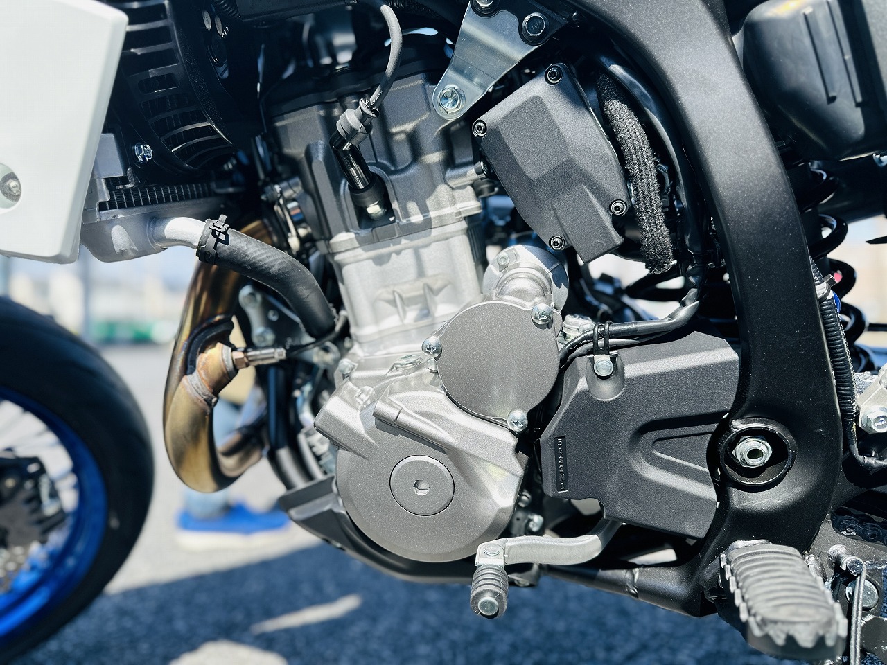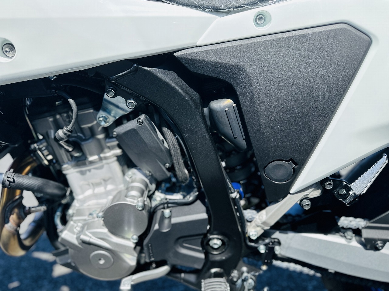 お次はエンジン左側!!基本設計は踏襲しつつ・・・分かりますか?シリンダーブロックから生えているスパークプラグが・・・!なんとデュアルスパークプラグをDR-Zも採用しました!! これのお陰で持病とも言われていた、ラフにアクセル開けてエンストするのが大幅に軽減されました!!試乗した感じではほぼほぼ出ないな、といった感想でした☆ なんといってもインジェクションになったのが大きな違いですね! 旧型はBSR36Φキャブでしたが新型は42Φのスロットルボディを装備!! よりリニアな走りが可能となっています☆